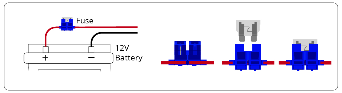 To fit the fuse holder (when using a 12V battery) cut the red wire and feed each end into the holder, tightly close the holder with a pair of pliers, then fit the fuse into the holder. Fuses should only be fitted once all connections are made.